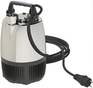 Dränkbar enhjulspump i rostfritt stål med vertikalt utlopp och backventil på sugsidan.